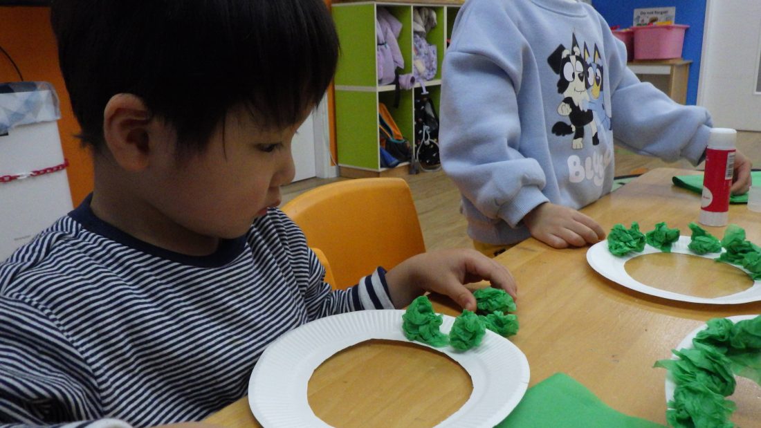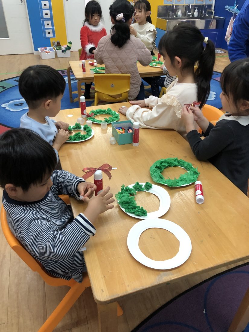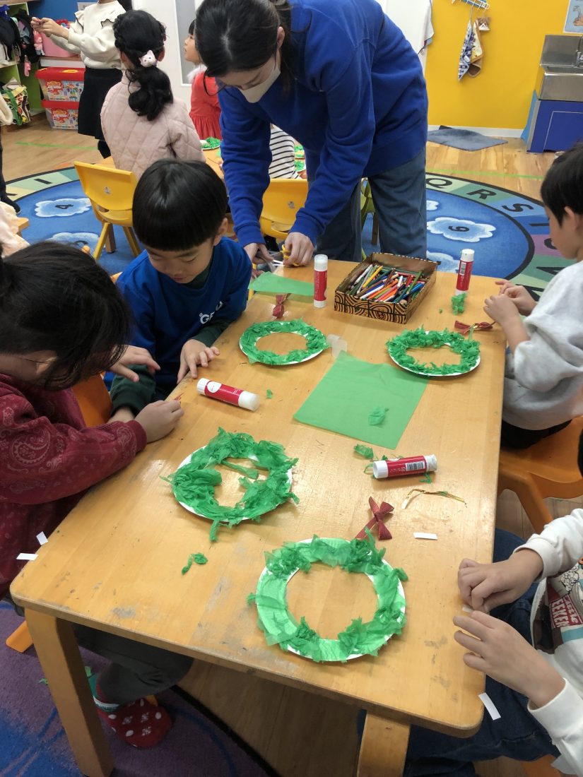午後は、クラフトタイムでクリスマスリースを作りました!みんな緑色の紙を丸めて上手にリースを作っていました!あと後半の2日間も楽しみにしててください!