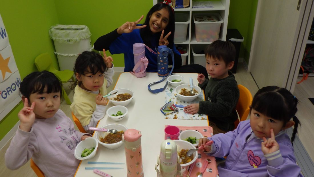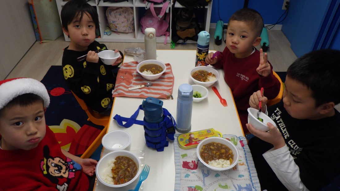3日目のランチメニューは、カレーライスでした!🍛 みんな人参やじゃがいもなどの野菜を上手に切って楽しくクッキングをしていましたよ!カレーの匂いがしてくると、みんな「I am hungry!」や「いい匂いがする〜」などカレーが出来上がるのをすごく待っていました😃