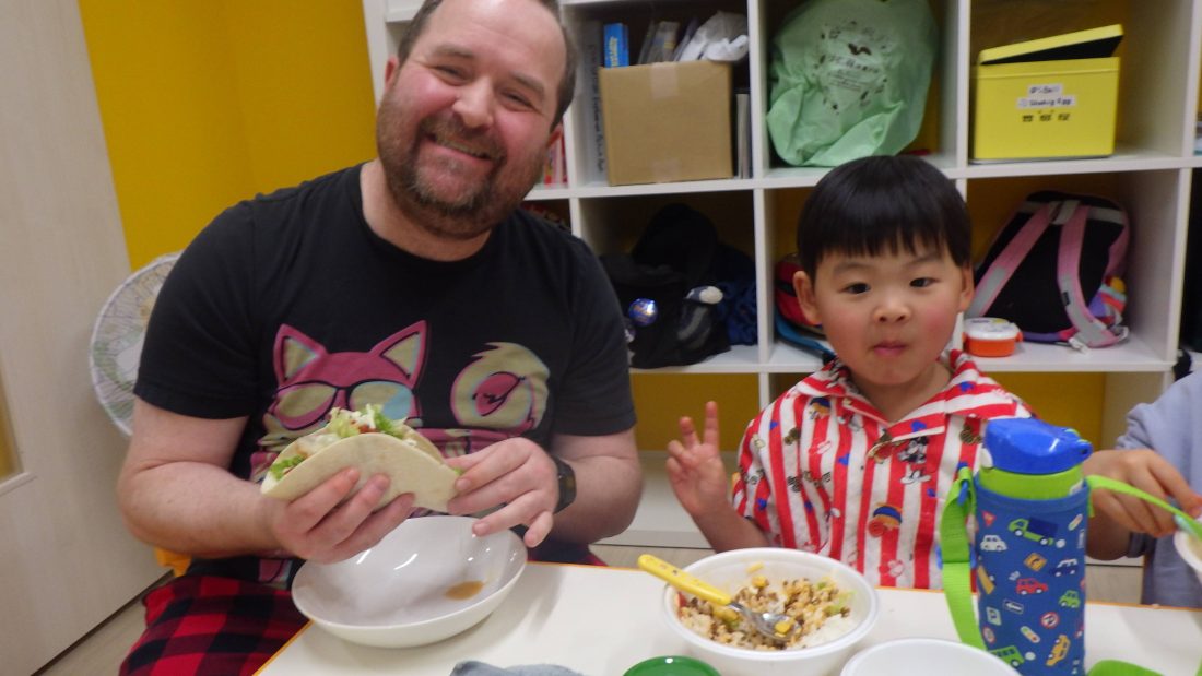 出来上がったタコライスをみんなでトマトやレタスをチョイスして「So, Yummy!!」と言って、美味しそうにたくさん食べていました😋