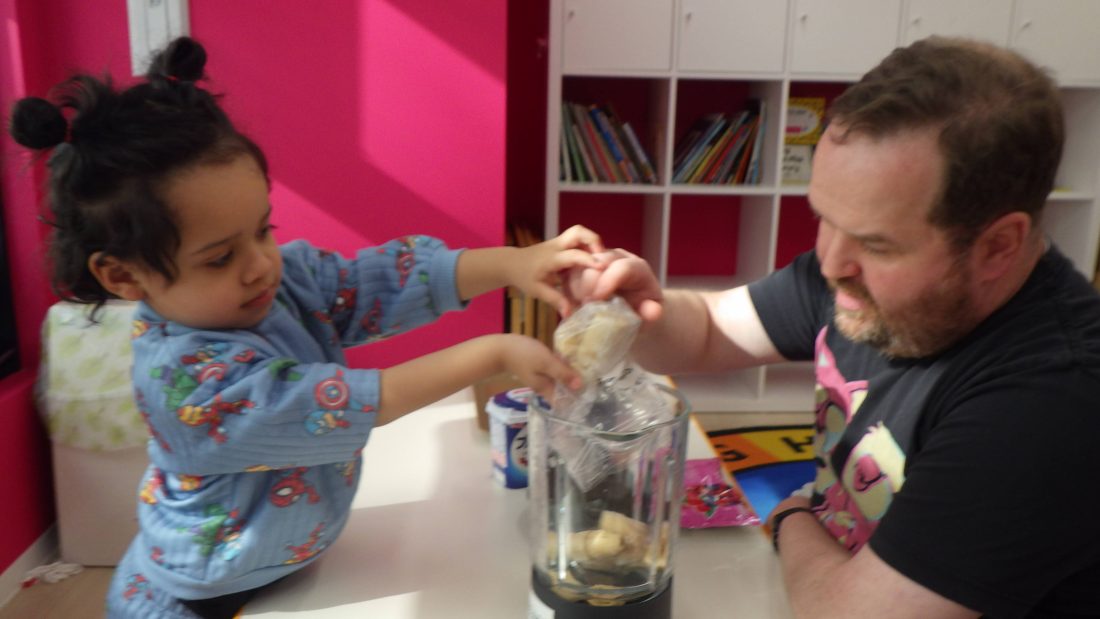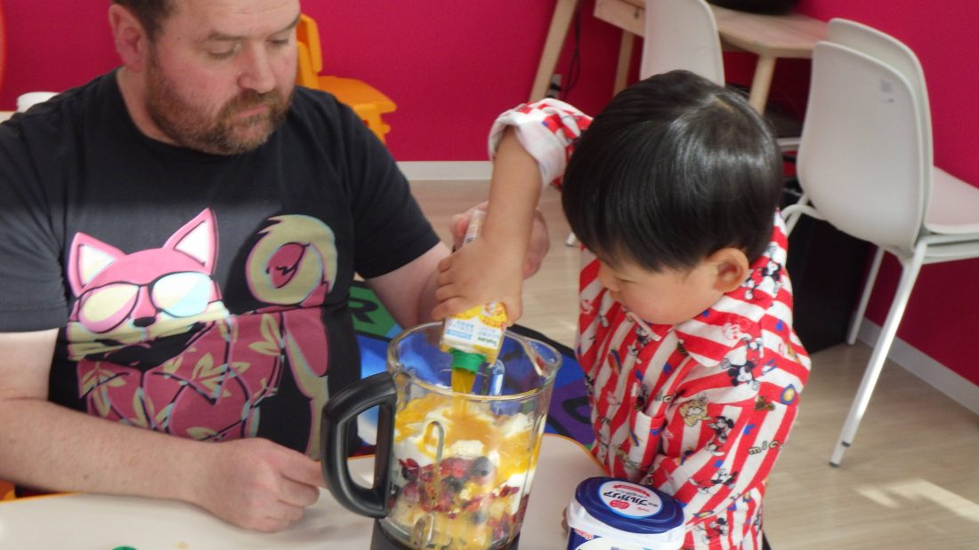 その後、デザートとして、ミックスベリーのスムージーを作りました😊ミキサーに冷凍ミックスベリーやバナナ、ヨーグルトなどをに入れて、ミキサーのスイッチをオンにすると中の具材が回転して混ざる姿を見てみんな興奮していましたよ🤩✨出来上がったスムージーを幸せそうに食べていてほとんどの子どもたちがおかわりしていました😆